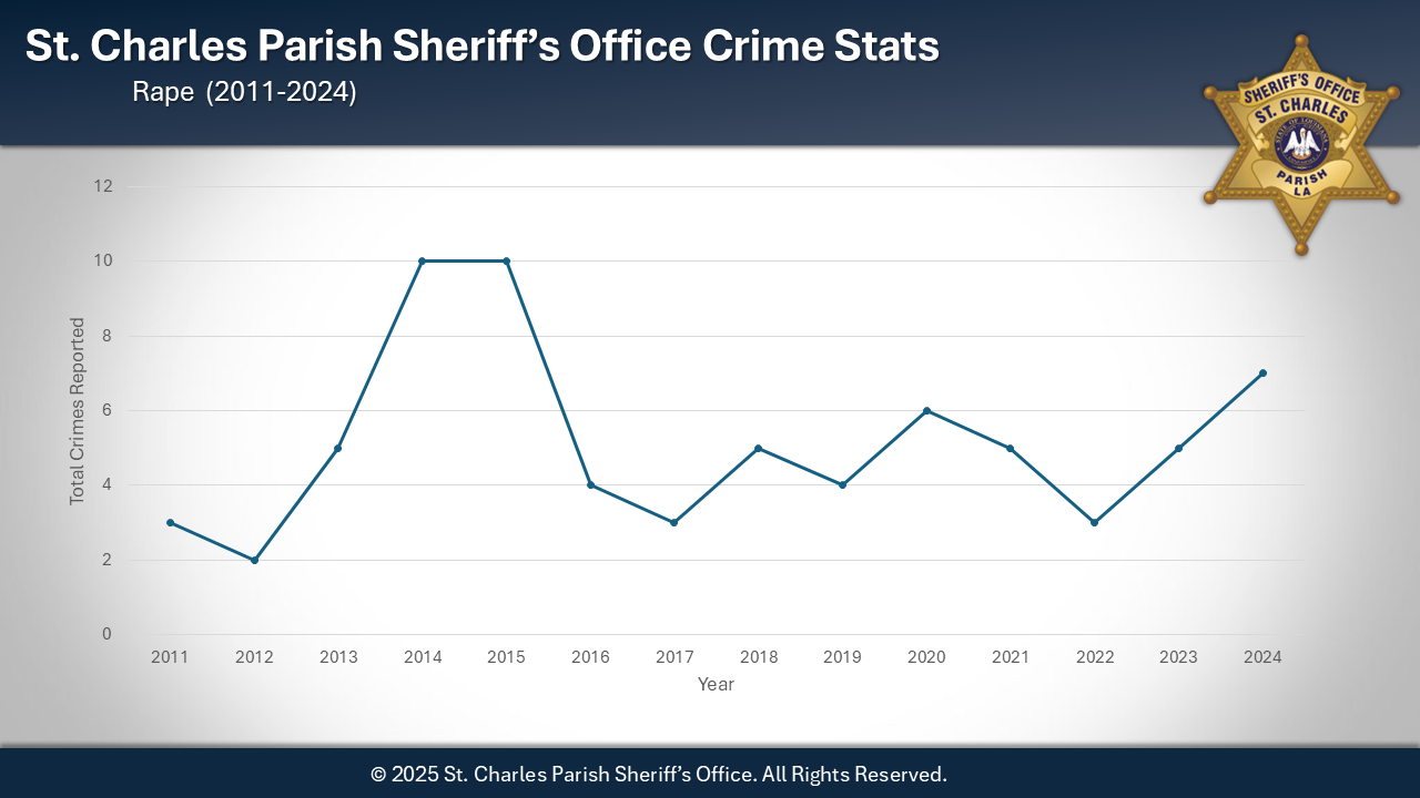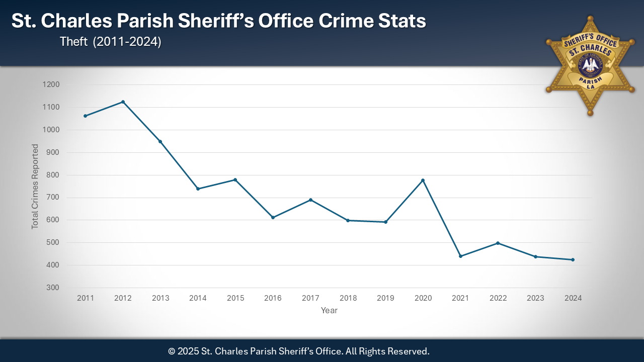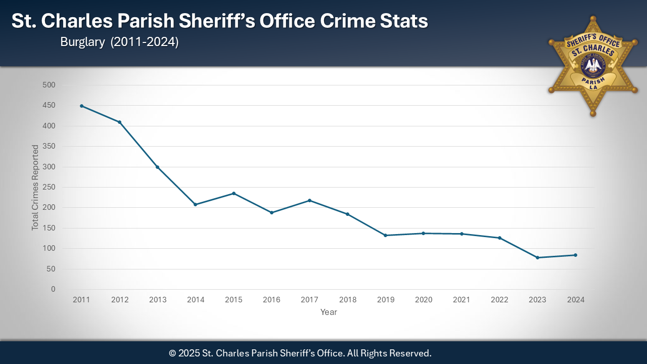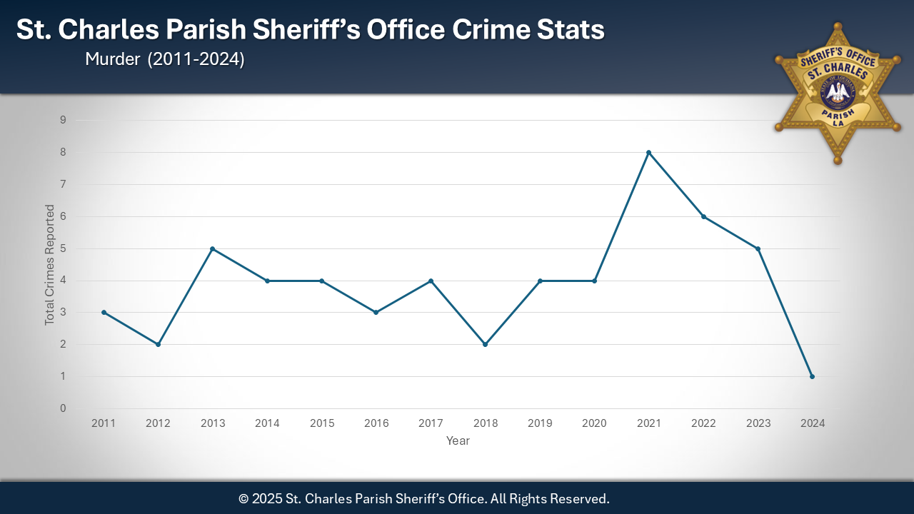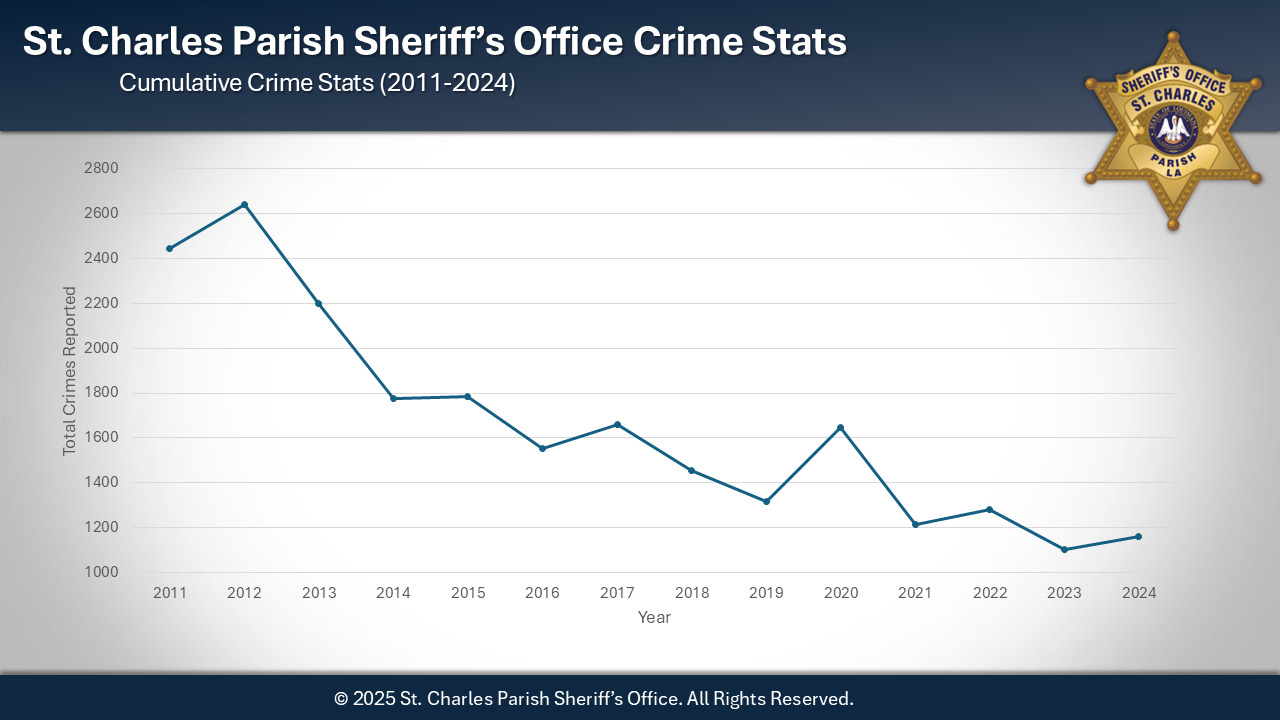 Sheriff Greg Champagne is pleased to announce that 2024 marked the second-lowest crime rate in 28 years for the St. Charles Parish Sheriff's Office. Although there was a slight increase in crime during 2024, it remains the second-best year overall for crime reduction. Notably, there was a significant decrease in homicides, with only one reported this year. The individual arrested in connection with the homicide is currently in jail, awaiting trial for second-degree murder after the death of his domestic partner. This achievement is a testament to the collaborative efforts of our law enforcement agency, community organizations, and the citizens of St. Charles Parish.