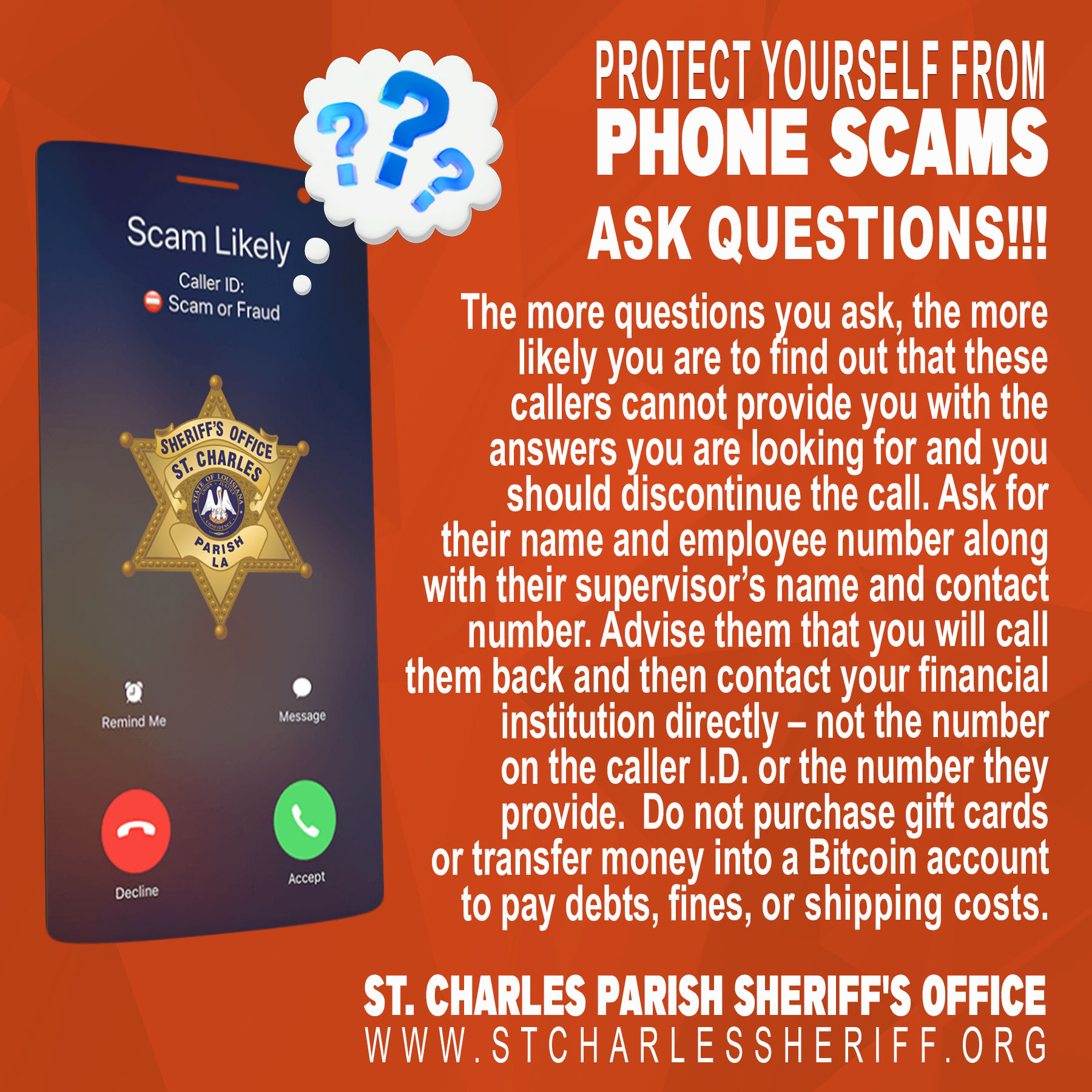 If you think you are being scammed, please hang up and contact your local banking agency or the Sheriff's Office at (985) 783-6807.