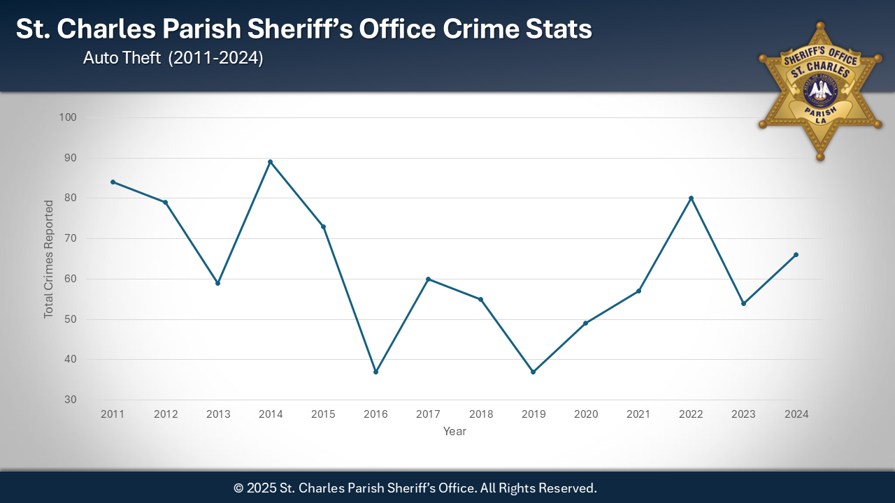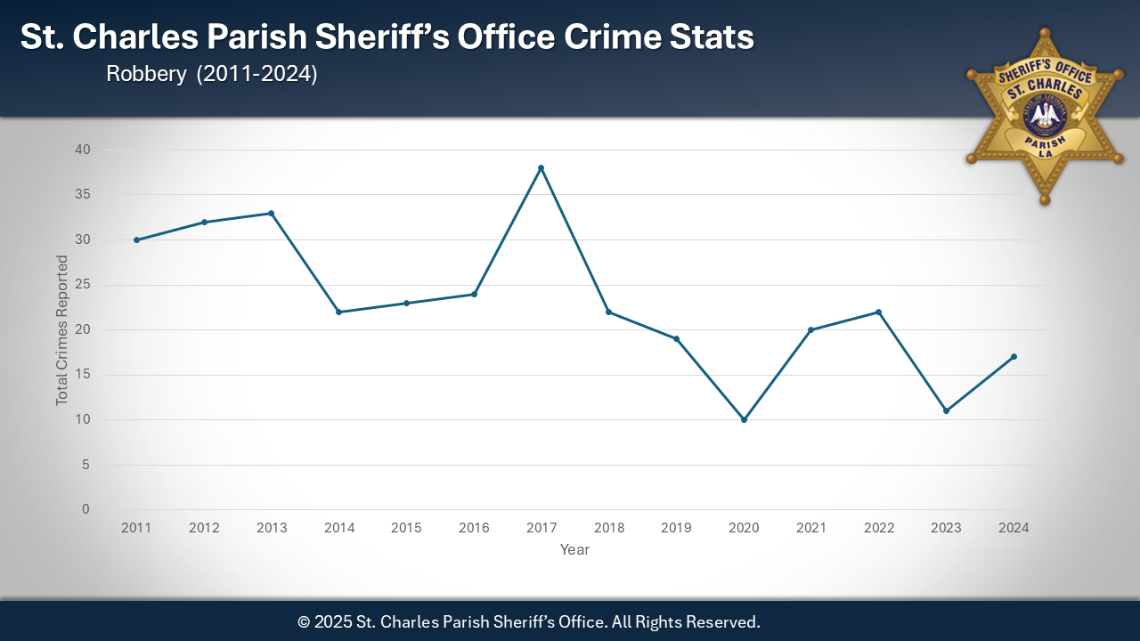 Sheriff Greg Champagne is pleased to announce that 2024 marked the second-lowest crime rate in 28 years for the St. Charles Parish Sheriff's Office. Although there was a slight increase in crime during 2024, it remains the second-best year overall for crime reduction. Notably, there was a significant decrease in homicides, with only one reported this year. The individual arrested in connection with the homicide is currently in jail, awaiting trial for second-degree murder after the death of his domestic partner. This achievement is a testament to the collaborative efforts of our law enforcement agency, community organizations, and the citizens of St. Charles Parish.